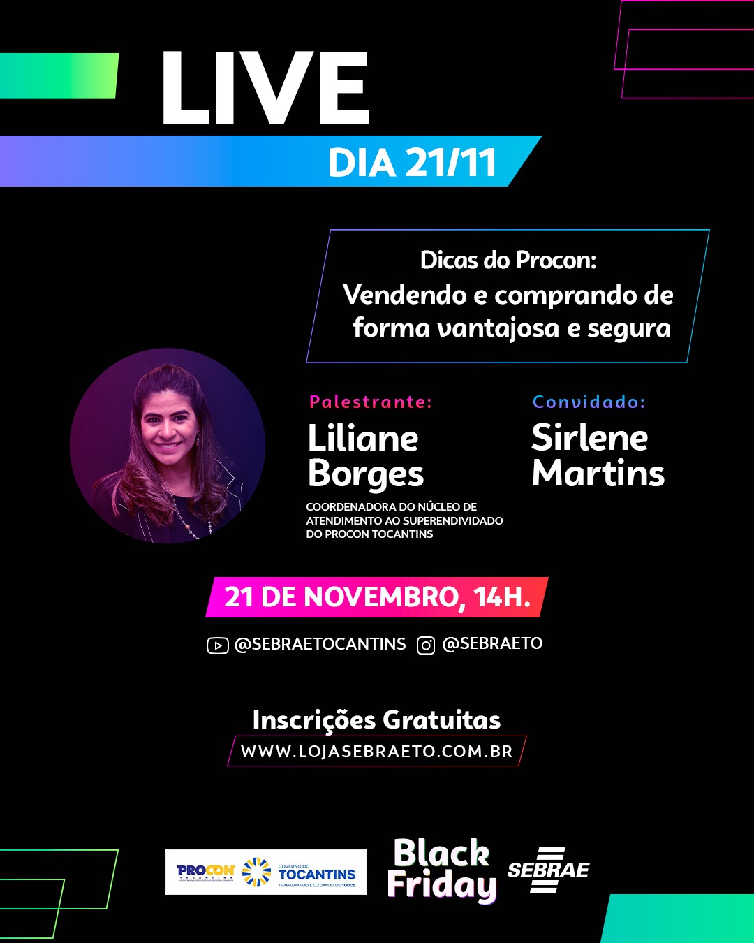 As próximas lives estão agendadas para os dias 14 e 21 de novembro, abordando as temáticas “Sua Black do físico ao digital” e “Dicas do Procon: vendendo e comprando de forma vantajosa”, respectivamente.