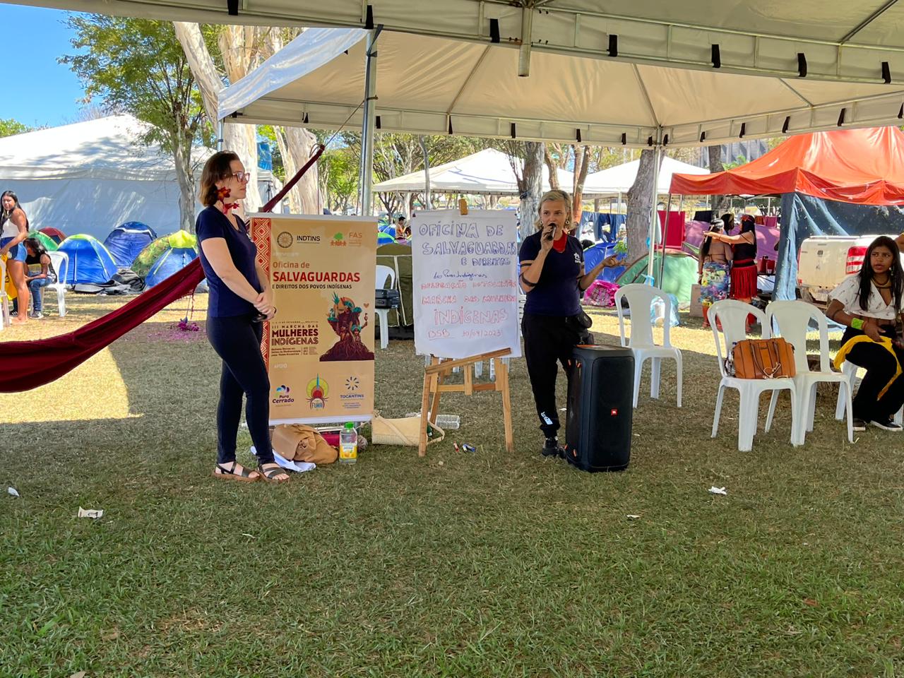 O ciclo de oficinas “Salvaguardas e Direitos dos Povos Indígenas” esteve na III Marcha das Mulheres Indígenas em Brasília e fez parte da programação das mulheres tocantinenses, participantes da Marcha, seus companheiros e de outros interessados, na segunda-feira, 11. Os povos do Tocantins estiveram representados por mulheres Krahô, Krahô-Kanela, Karajá, Javaé, Apinajé e Xerente. Durante a oficina elas puderem receber informações sobre a importância de manter a floresta viva, o que é o REDD+, e os direitos dos povos indígenas em relação a projetos que sobrepõe seus territórios.