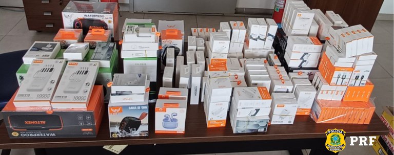 Ao abrir o compartimento de cargas, os policiais encontraram uma caixa recheada de eletrônicos: eram 170 itens, como caixas de som, carregadores, fones de ouvido, baterias portáteis e vários tipos de cabos.