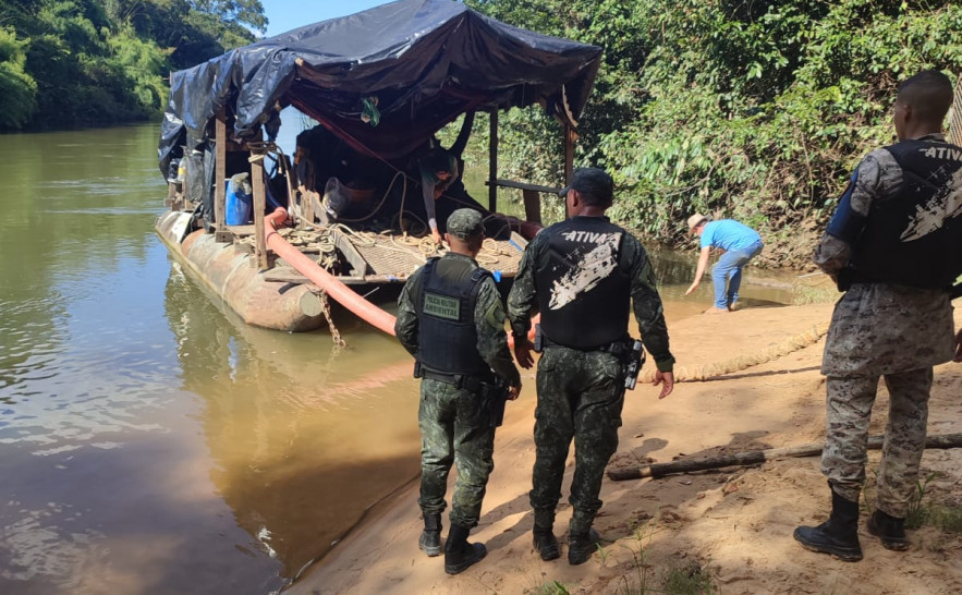 No local, foram identificadas duas balsas mineradoras (dragas) equipadas com sistemas de sucção para o beneficiamento de ouro, além de motores e compressores de ar.