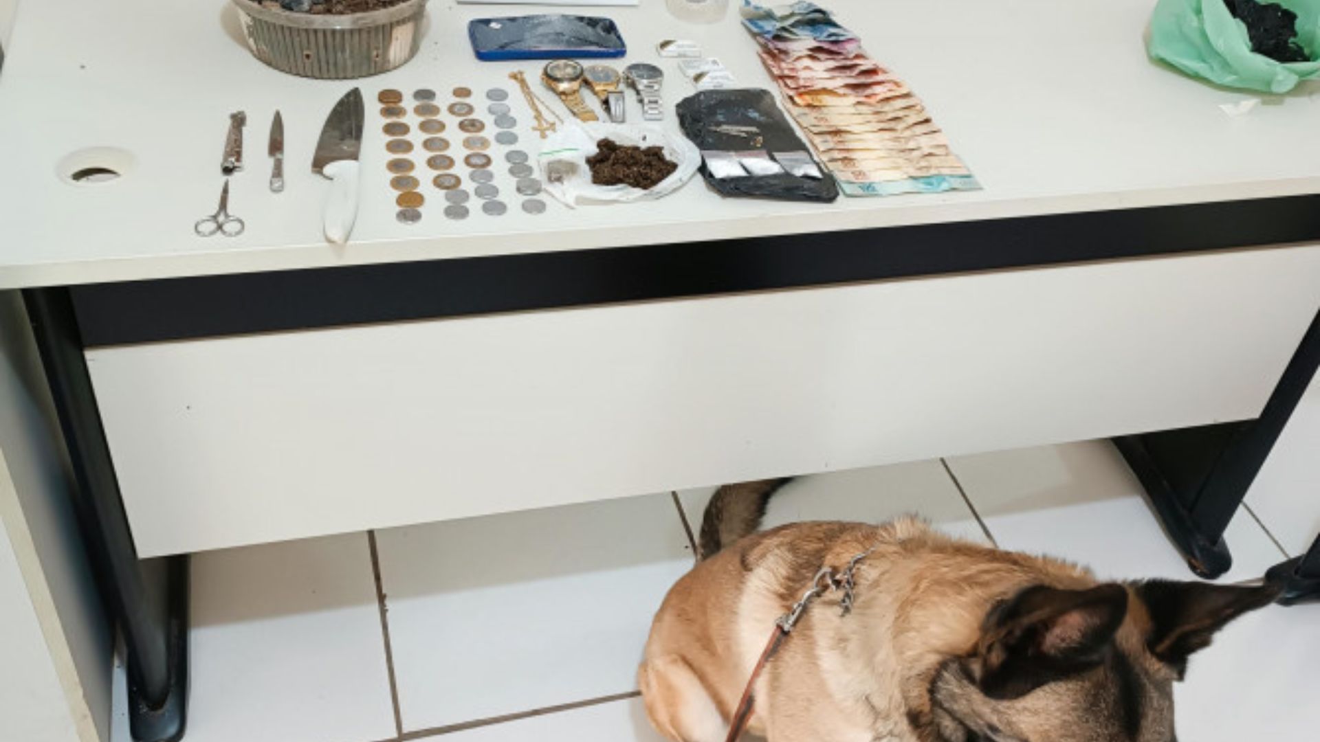 Ao perceber a presença da equipe, o morador tentou se desfazer das drogas, jogando porções de cocaína e maconha no vaso sanitário. Contudo, os entorpecentes foram recuperados. No interior da residência, com acompanhamento de um advogado, os policiais encontraram mais drogas, dinheiro em espécie, objetos sem origem comprovada e utensílios com vestígios de uso para preparo e consumo.