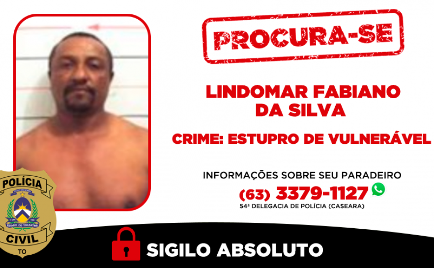 A Polícia Civil do Tocantins está procurando Lindomar Fabiano da Silva, de 48 anos, indiciado por abusar de uma menina de 8 anos em Caseara. Ele está foragido e qualquer informação sobre seu paradeiro pode ser enviada de forma anônima para a Delegacia de Caseara, pelo telefone/WhatsApp (63) 3379-1127.