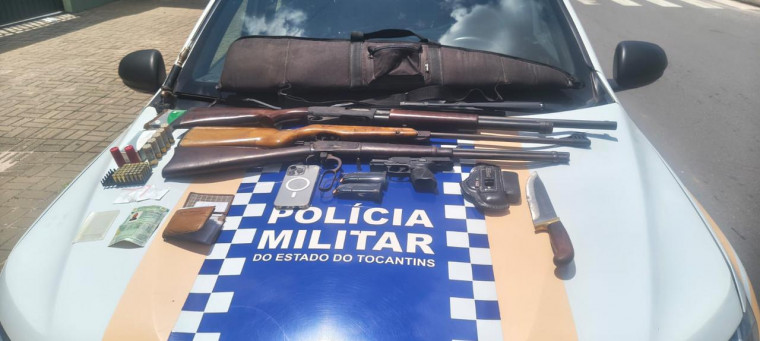 Durante as buscas no local, os policiais apreenderam uma pistola Taurus calibre 9mm municiada, uma carabina calibre .38, uma espingarda calibre .12 e uma arma de pressão adaptada para calibre .22.