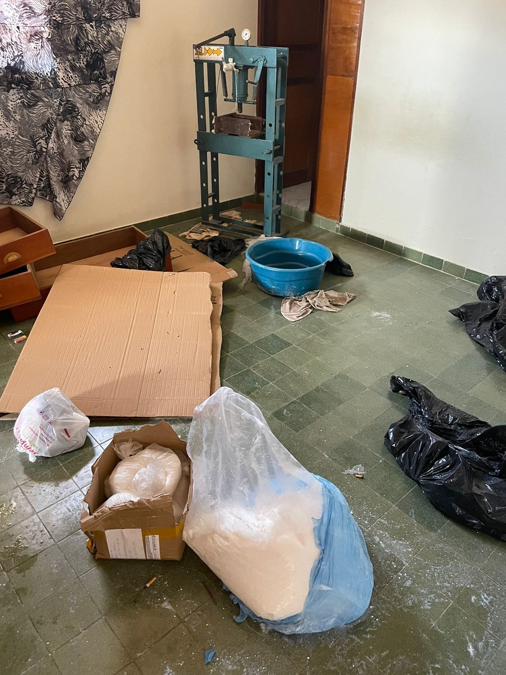 Durante as investigações, as equipes descobriram que o suspeito estava foragido e possivelmente envolvido no tráfico de drogas em uma casa no centro da cidade. Ao cumprir o mandado de prisão, os policiais se depararam com o laboratório em pleno funcionamento e encontraram cerca de 10 kg de drogas variadas, uma prensa para refino da droga e munições de calibres diversos.
