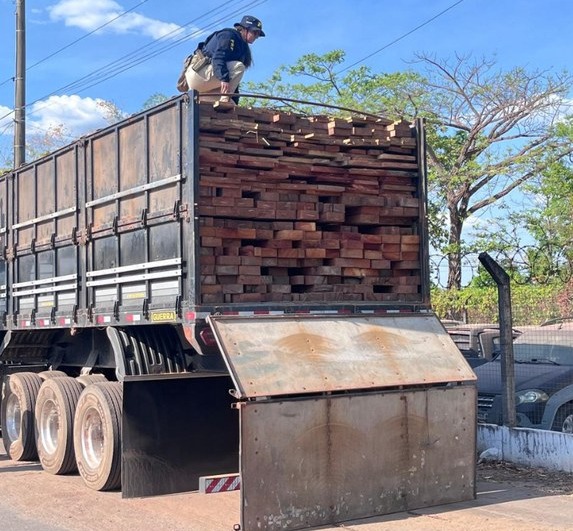 Durante fiscalização no km 332 da BR-153, a equipe da PRF parou um caminhão Volvo FH 440. O motorista, de 37 anos, não apresentou documentos que comprovassem a legalidade da carga. Ao inspecionar o veículo, os agentes encontraram duas Guias Florestais para Transporte de Matéria-Prima Florestal Diversa com indícios de fraude. A carga totalizou 58,29 m³ de madeira.