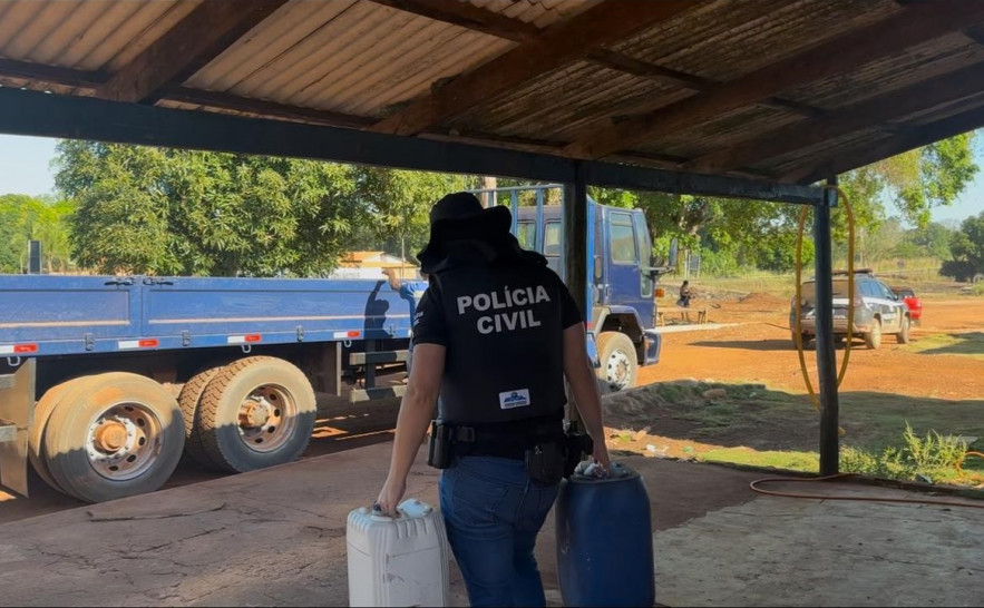 Ainda na operação, os policiais acharam uma grande quantidade de combustíveis e agrotóxicos guardados de forma clandestina em uma propriedade rural. Um dos investigados estava cuidando desse material irregular, que pode causar riscos graves para as pessoas e o meio ambiente.
