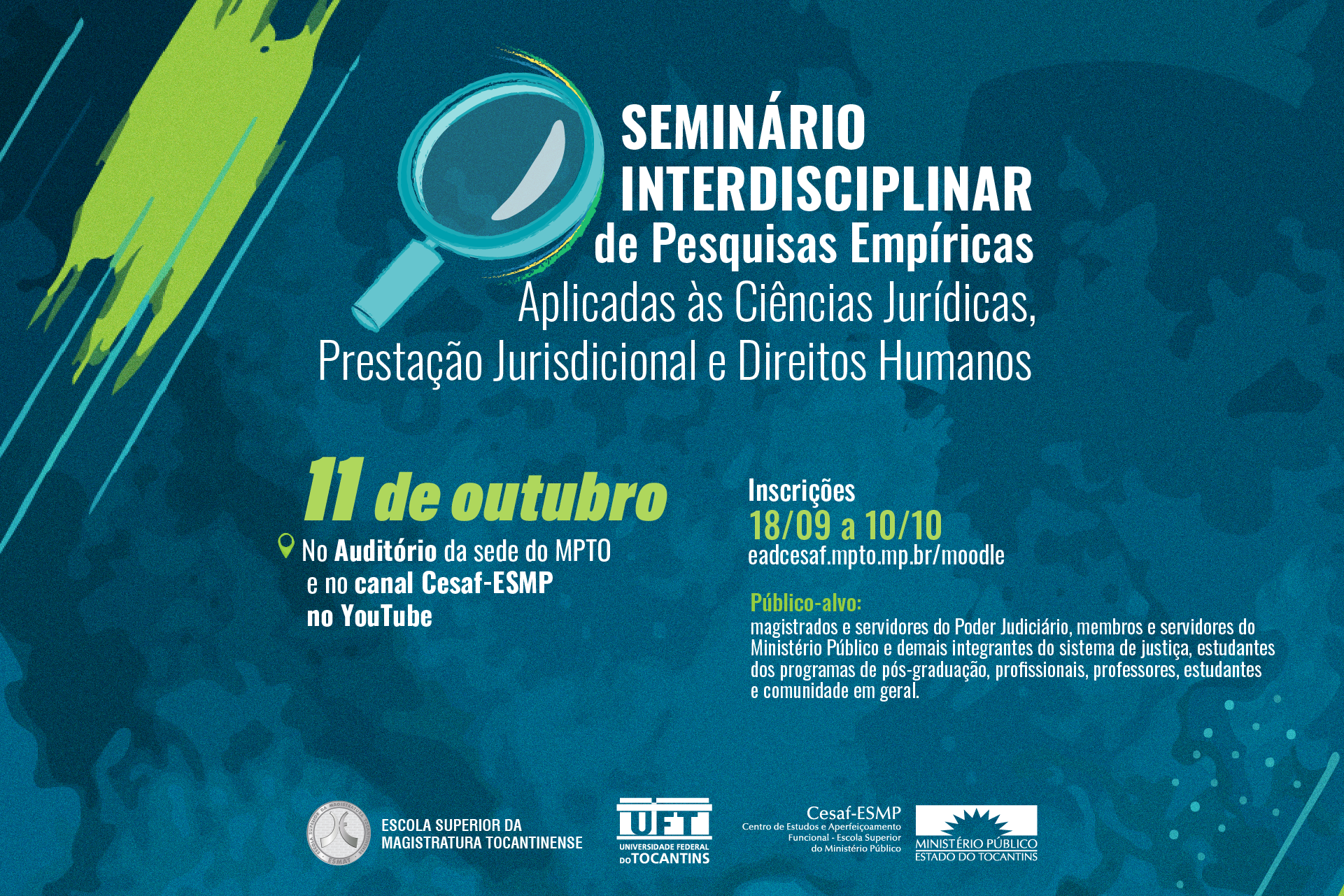 Encontram-se abertas as inscrições para o Seminário Interdisciplinar de Pesquisas Empíricas Aplicadas às Ciências Jurídicas, Prestação Jurisdicional e Direitos Humanos promovido pelo Centro de Estudos e Aperfeiçoamento Funcional – Escola Superior do Ministério Público (Cesaf/ESMP), pela Escola Superior da Magistratura Tocantinense (Esmat) e pela Universidade Federal do Tocantins (UFT), que é direcionado aos membros e servidores do Ministério Público do Tocantins (MPTO); magistrados e servidores do Poder Judiciário e demais integrantes do sistema de justiça; estudantes dos programas de pós-graduação, profissionais, professores, estudantes e comunidade em geral.